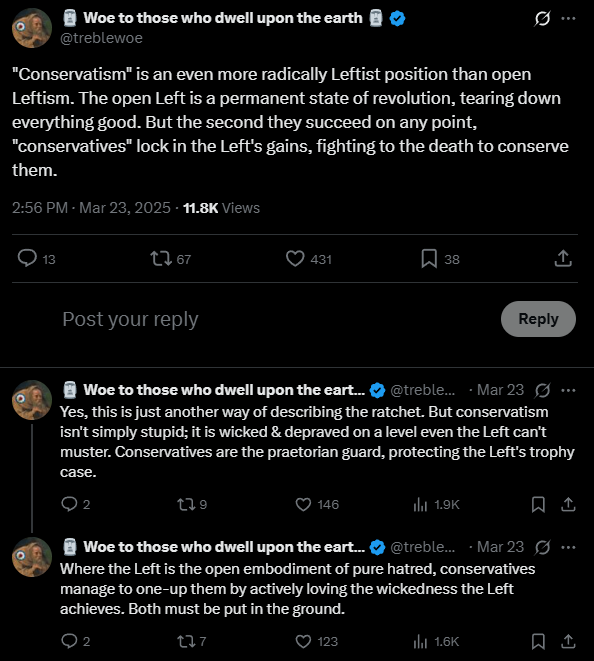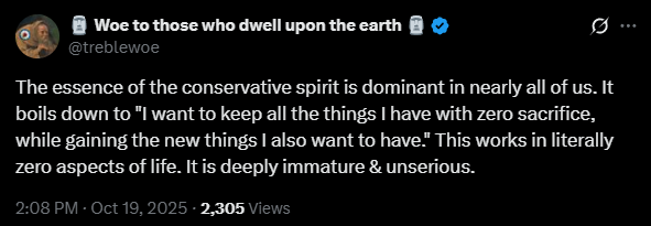 How exactly does this happen? Why do they constantly betray their supposed principles? He notes that conservatives “have adopted at appropriate intervals of time those ideas made respectable by radical propaganda.” This, of course, is the propaganda of the left. The left constantly fights tooth and nail to achieve its goals, while the conservatives give some half-hearted protest at best, which today comes in the form of strongly worded tweets and memes. Once the left achieves its goals, the conservative either does nothing at best or completely accepts the left’s gains as settled precedent and completely surrenders—a corrupt combination of cowardice and hypocrisy. This fact has also been noted by Woe, co-host of the Stone Choir podcast.